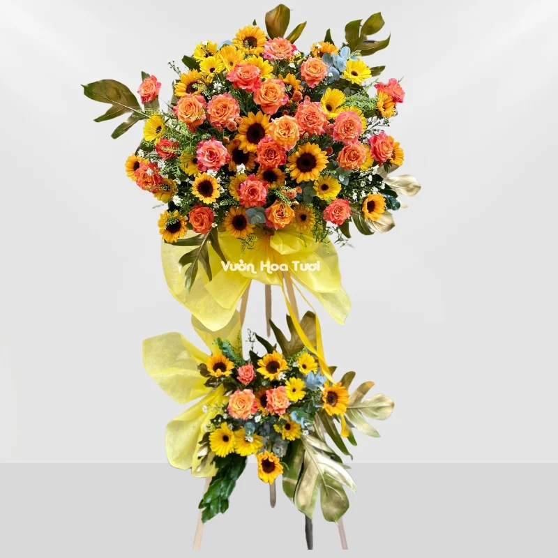 Bạn có thể dành tặng mẫu Kệ Hoa Khai Trương 2 Tầng Cát Tường Thịnh Vượng này cho các dịp khai trương, khánh thành, động thổ hay kỷ niệm công ty đối tác. Mẫu hoa hướng đến sự sang trọng với các loại hoa độc đáo như hoa hồng cam spirit tràn đầy năng lượng phối cùng hoa hướng dương ngọt ngào.